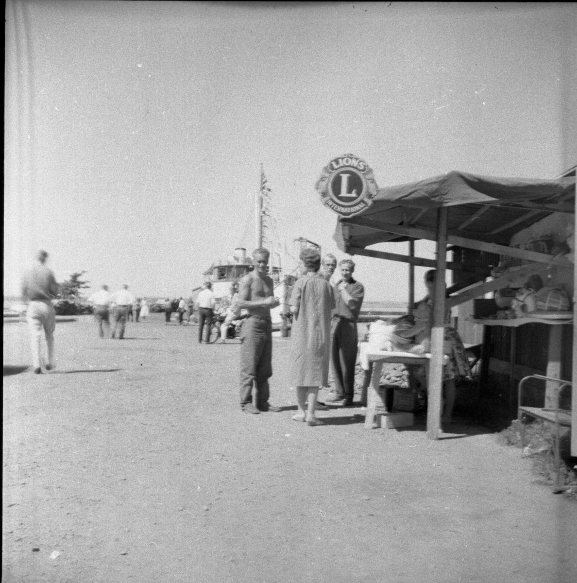 Fonden är en hamn där det ligger en större passagerarbåt. I förgrunden står ett marknadsstånd med Lions logga på. Framför marknadsståndet står en barbröstad man och en kvinna.