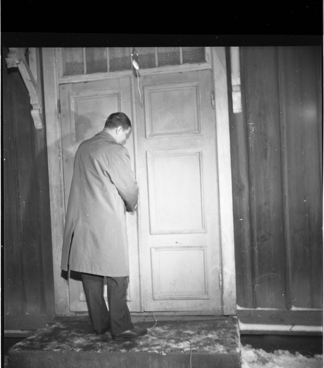 En man står och låser upp en dörr. Dörren har tre speglar. Mannen bär en rock.