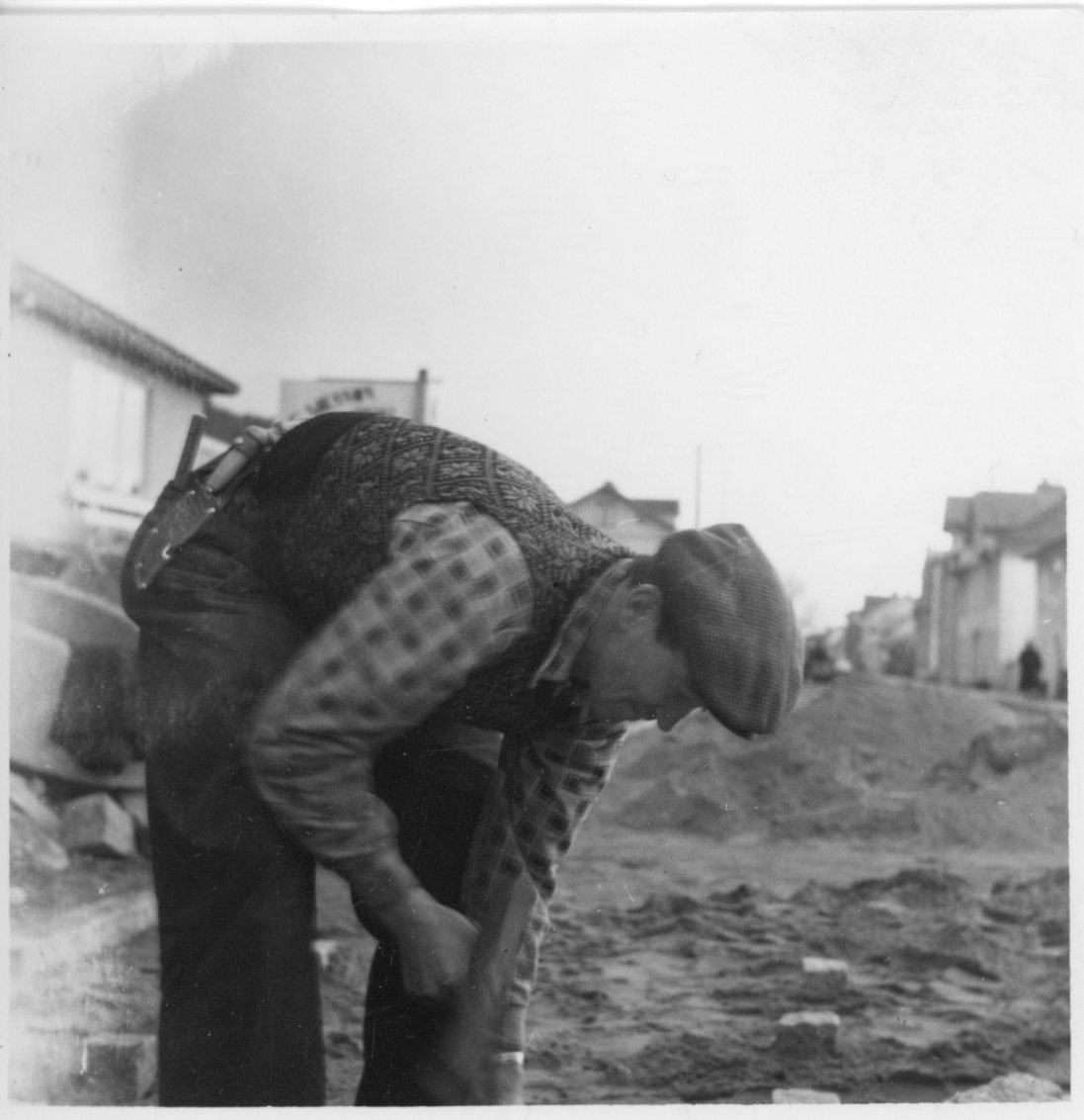 En man i rutig skjorta, mönstrad väst och keps på huvudet arbetar med stensättning av norra delen av Brahegatan i Gränna. Gatan har breddats.