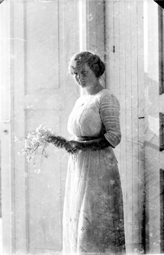 Porträtt av en ung kvinna i ljus klänning med en blommor i hand. Hon står i profil, inomhus mot en vägg, vänder ansikten en aning mot fotografen. Solen skiner in på henne från vänster.moman med bred mustasch och klädd i militär uniform som sitter i en stol. Han har sin kask under armen.