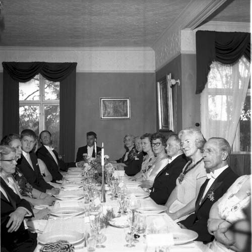Titel: Bröllopsgäster sitter vid ett uppdukat bord.