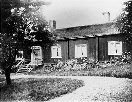 Låg rödfärgad envåningsbyggnad med locklistpanel och inbyggda knutar. Entre till vänster. Gräs, buskar och ett träd på gårdsplan.