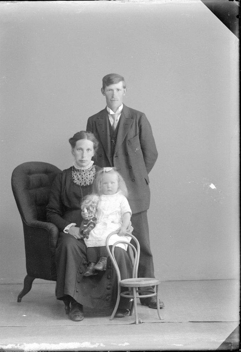 En kvinna sitter i en fåtölj med en liten flicka i knät, hon har en docka i händerna. En man står bakom dem.