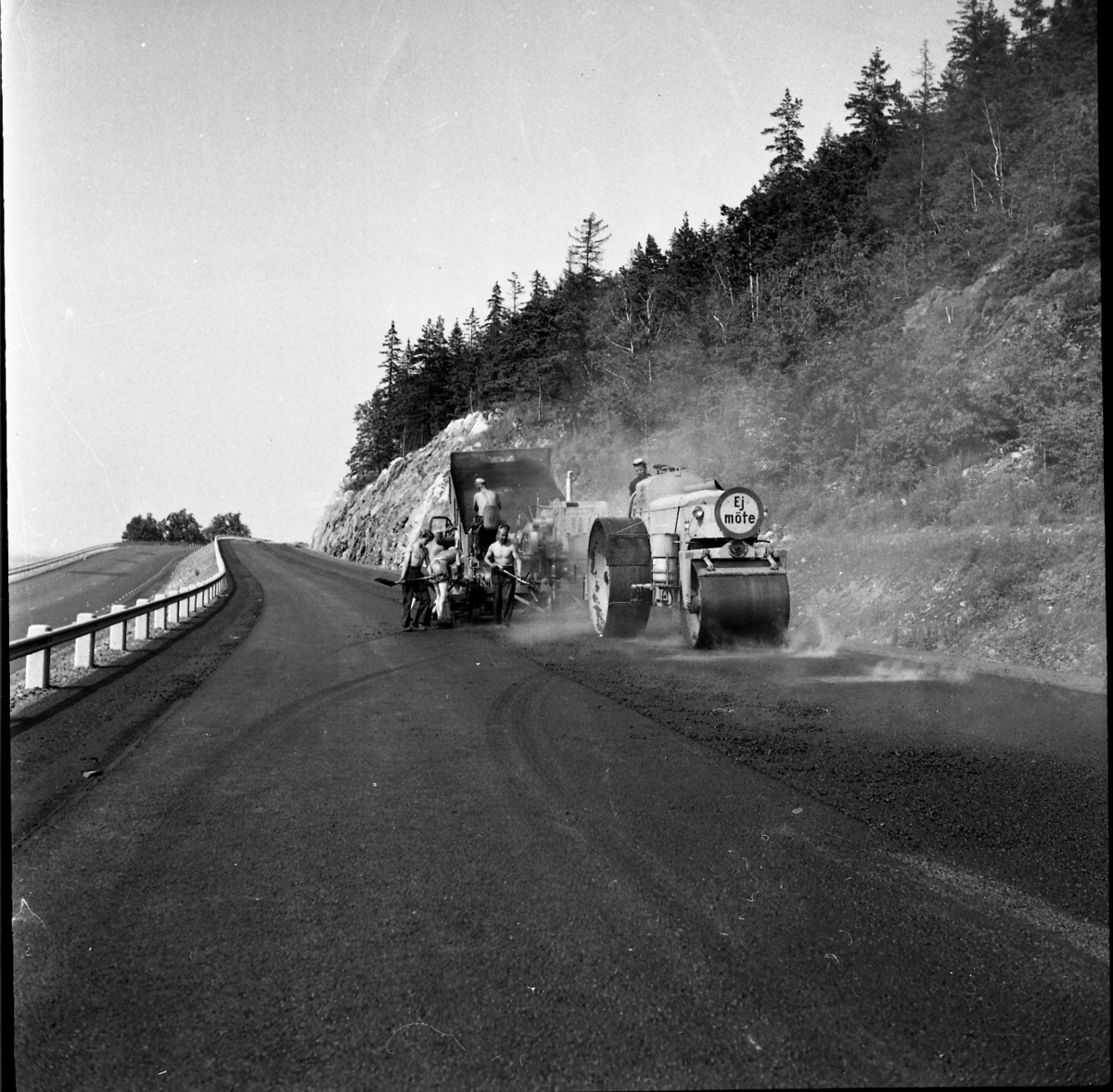En ångvält kör över nyligen utlagd asfalt. Flera arbetare med bar överkropp går bakom och rakar ut asfalt.