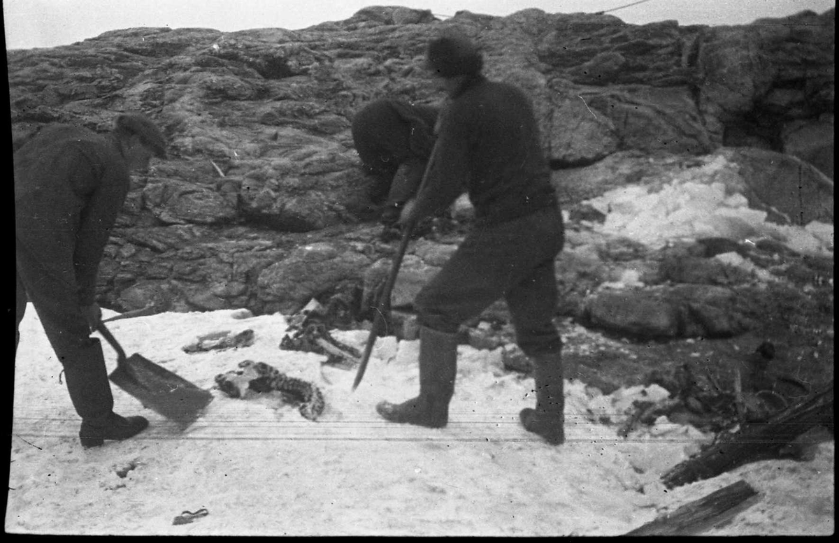 Okända män från Isbjörn vid utgrävning av Andréelägret på Vitön. Sannolikt skelettdelar från S A Andrée på isen mellan männen.