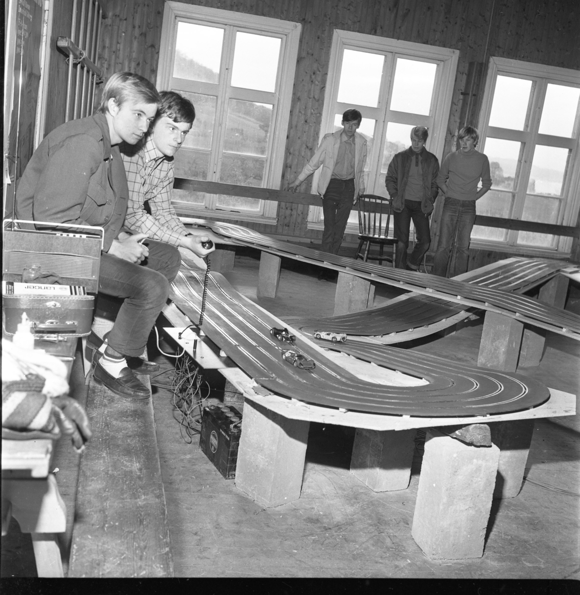 Två killar sitter och kör med en stor miniracingbana står uppställd på typ polsten. I bakgrunden vid fönster med 6 lufter står tre killar och tittar på. Från vänster: Svante Landström, Lars Rosenqvist, Sten Forsén, Thomas Johansson samt Carl-Gustaf Tollén.