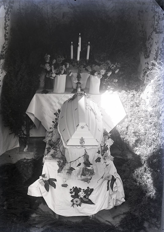 En ljus likkista står på en avsats täckt med ett ljust lakan, framför ett bord med duk, fem ljus och blommor.