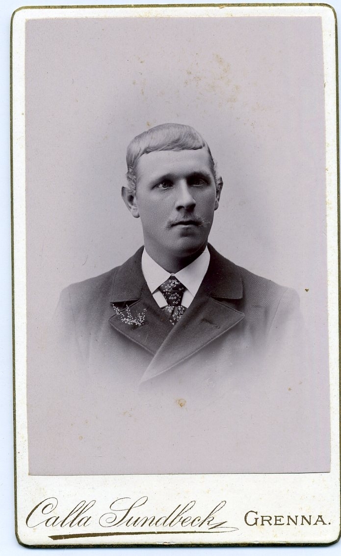 Kabinettsfotografi: bröstbild av okänd ung man med slips och blomma i kavajuppslaget.