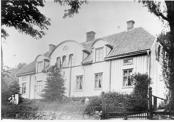 Borgmästargården från Bergsgatan. En äldre kvinna står till vänster med händerna i sidorna intill ett flaggstångsfäste. En yngre kvinna står högre upp till höger. En gran (?) växer central framför byggnaden.