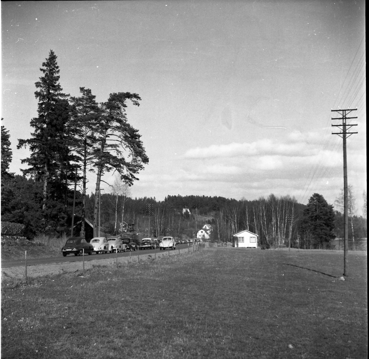 En lång rad bilar står parkerade på Tranåsvägen vid Bunnström med badplatsen till höger bakom björkdungen. En VW kommer körande mot fotografen. Enstaka hus utmed vägen.