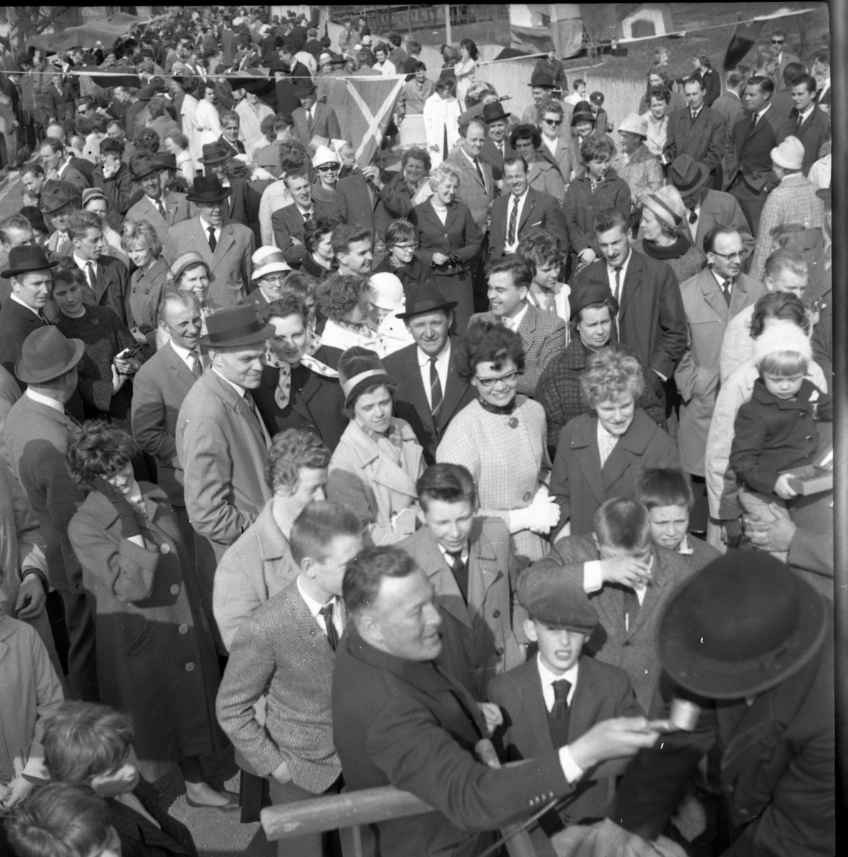 En bild tagen ned mot en stor folksamling på Sjögatan bakom Hallska gården. Till höger i bild syns kubben på en man som intervjuas, av möjligen Herbert Gustafsson.