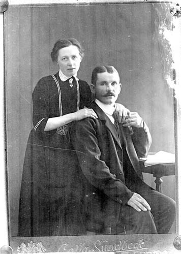 En man och en kvinna. Mannen sitter vid ett bord. Kvinnan står bakom med händera på hans axlar, de håller varandra i vänster hand.