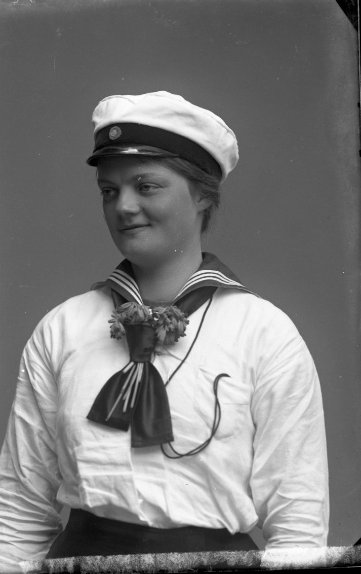 Porträtt av en ung kvinna med studentmössa och sjömansblus.