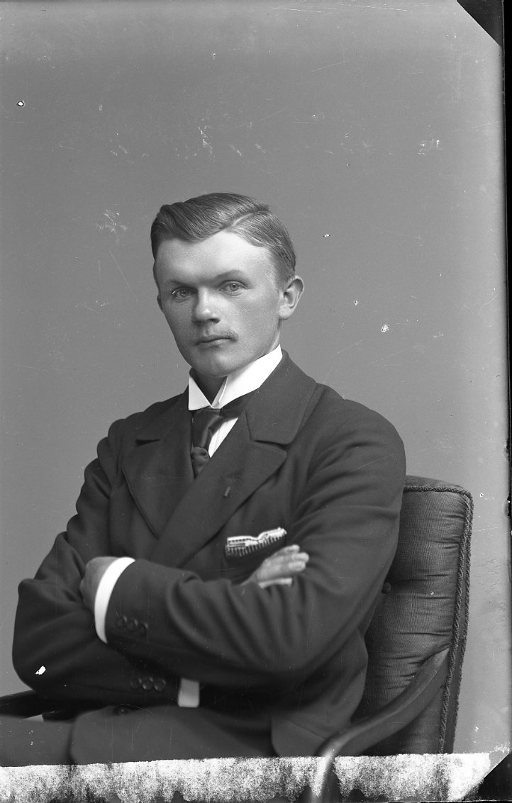 Titel: Porträtt av en ung man som sitter med armarna i kors.