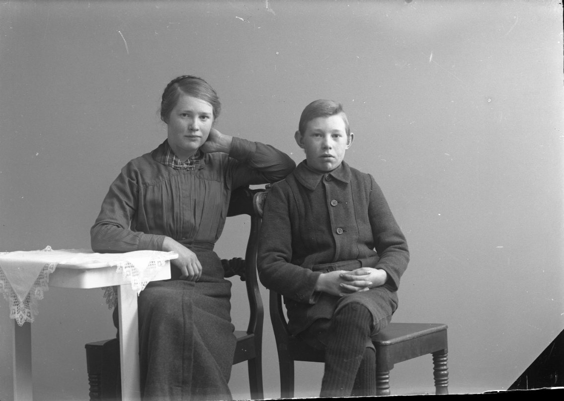 Porträtt av en ung kvinna och en pojke som sitter vid ett bord.