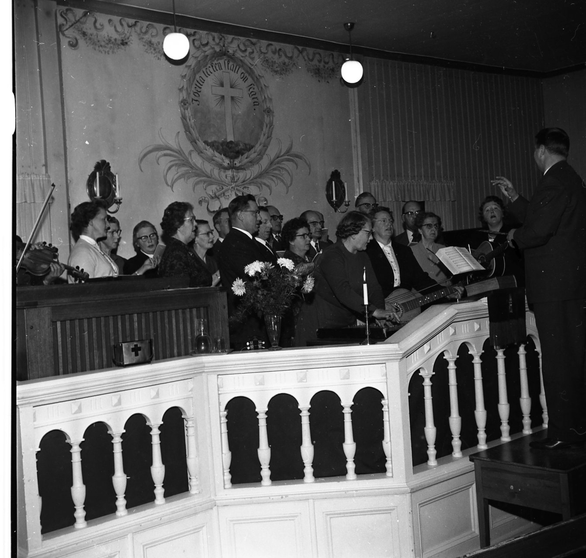 Titel: En kör står i en kyrka och sjunger. Några spelar gitarr. En man står och dirigerar kören.