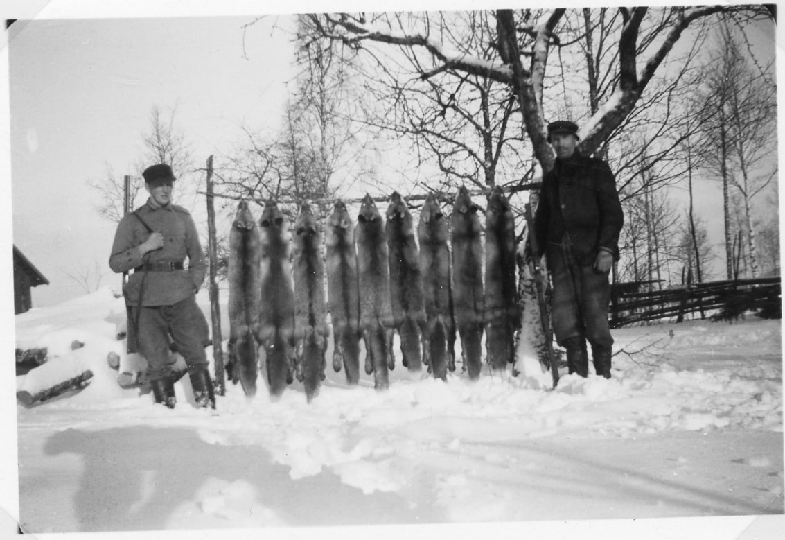 Nio skjutna rävar hänger på en stör, flankerade av två män med gevärr. Det ligger mycket snö på marken.