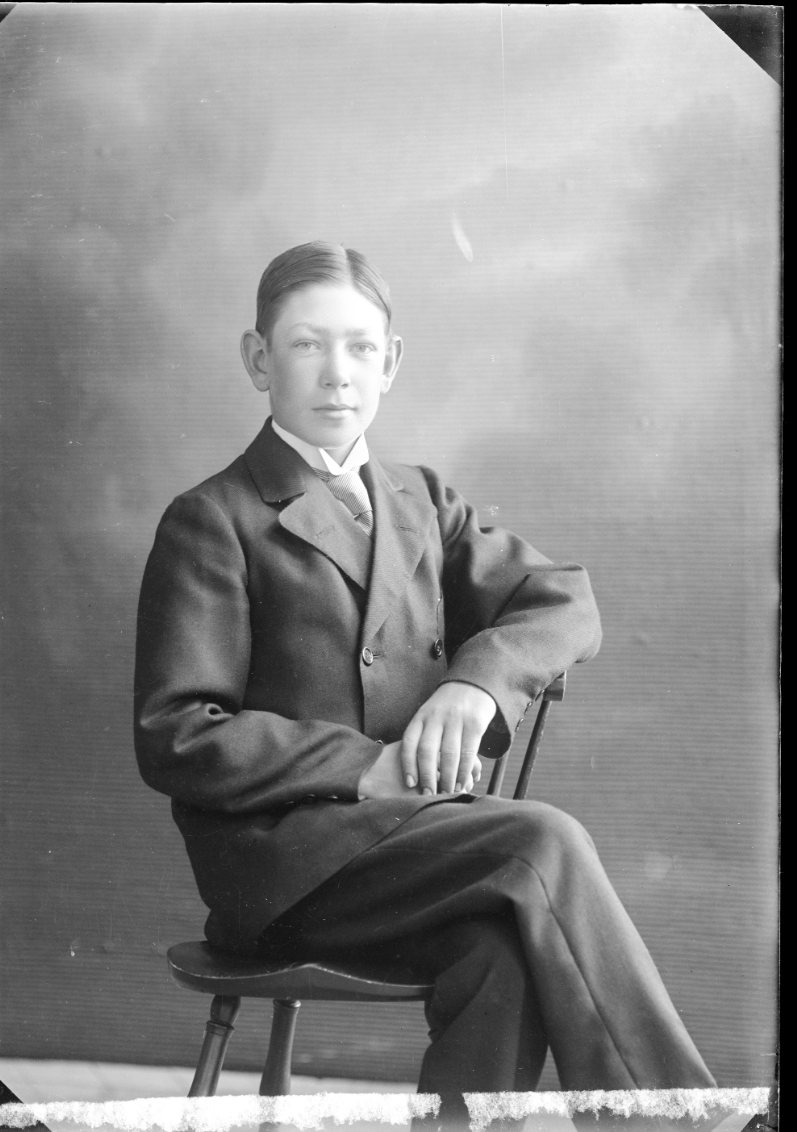 Porträtt av en pojke i tonåren. Han sitter på en stol.