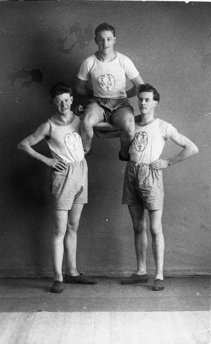 Tre idrottare i tröjor med logo T L I K (Tre Liljord Idrottsklubb). Två unga män håller upp en tredje som sitter på deras armar