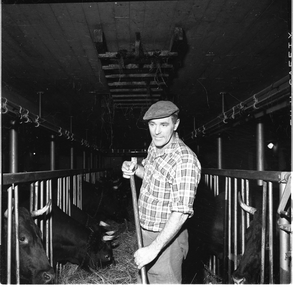 En bonde med keps och rutig skjorta strör ut foder till sina kor.