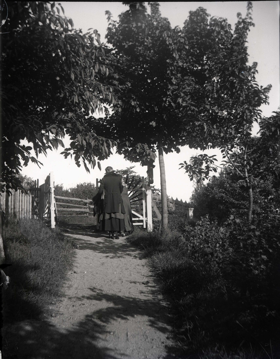 Två kvinnor bakifrån på väg ut från Ellen Keys Strand. Troligen Ellen Key och eventuellt Malin Blomsterberg.