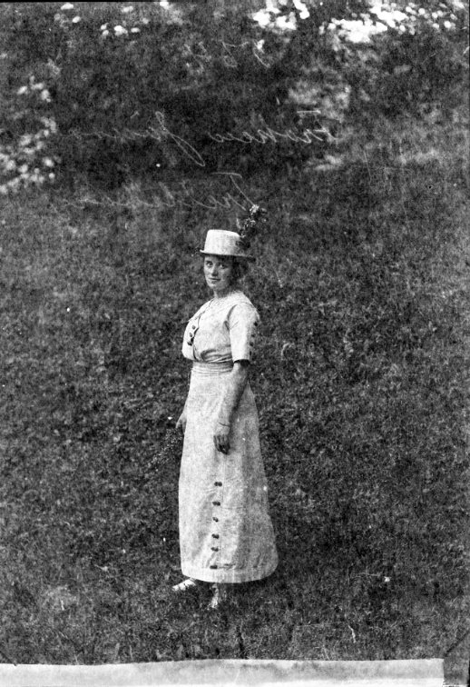 En kvinna i ljus kortärmad klänning och hatt står vid en grässlänt. En lodrätt knapprad på ärmen och nedtill på klänningen.