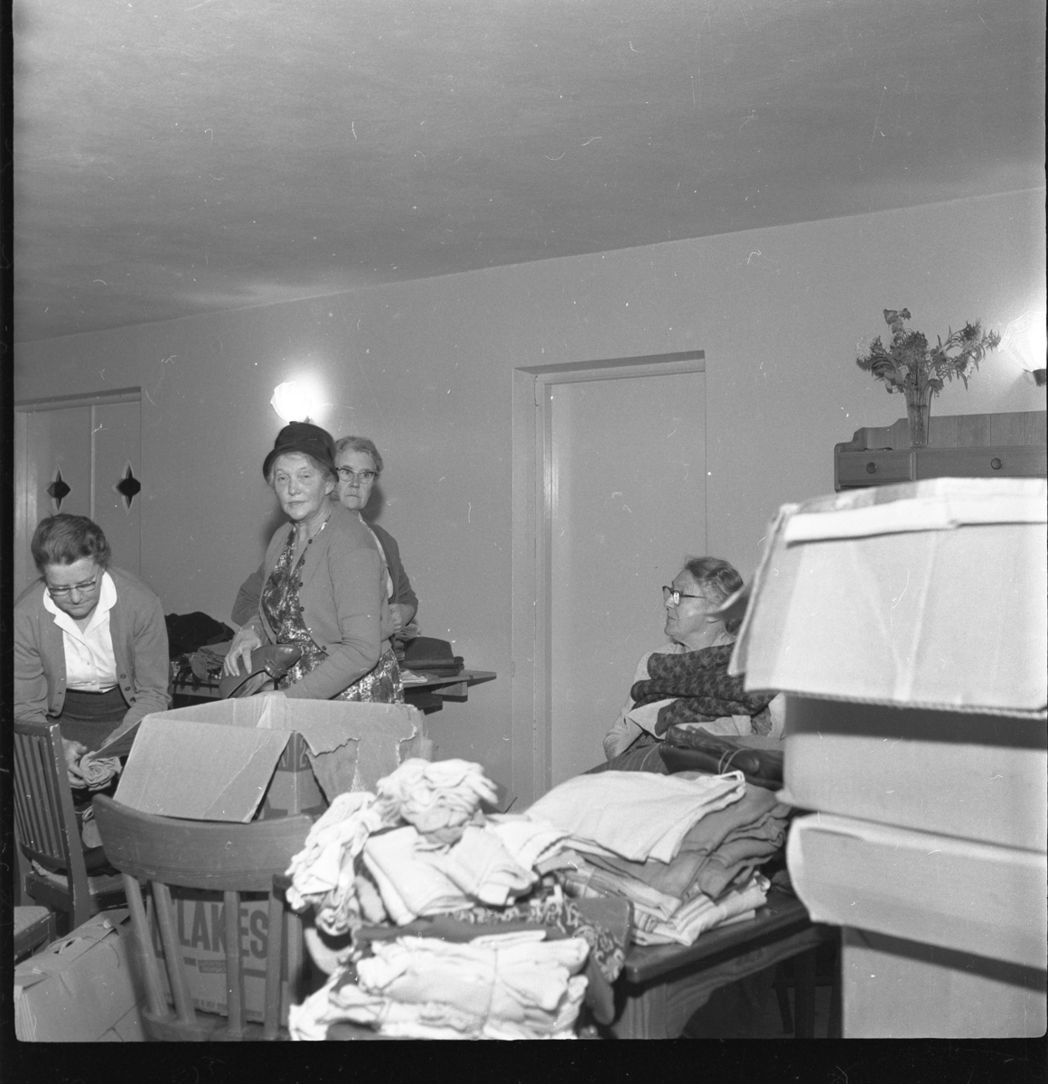Klädinsamling i Missionskyrkan i Gränna. Från vänster: Lilly Lago, Ingeborg Johansson, Märta Johansson samt sittande Carola Mellin.