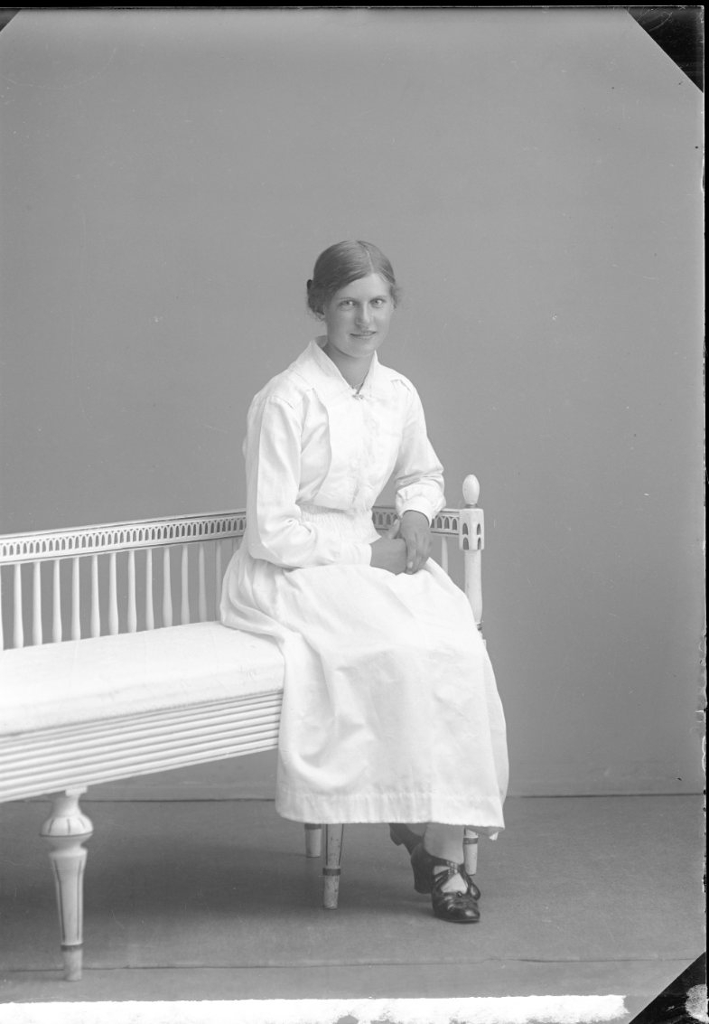 Porträtt av en flicka i tonåren som sitter i en soffa.