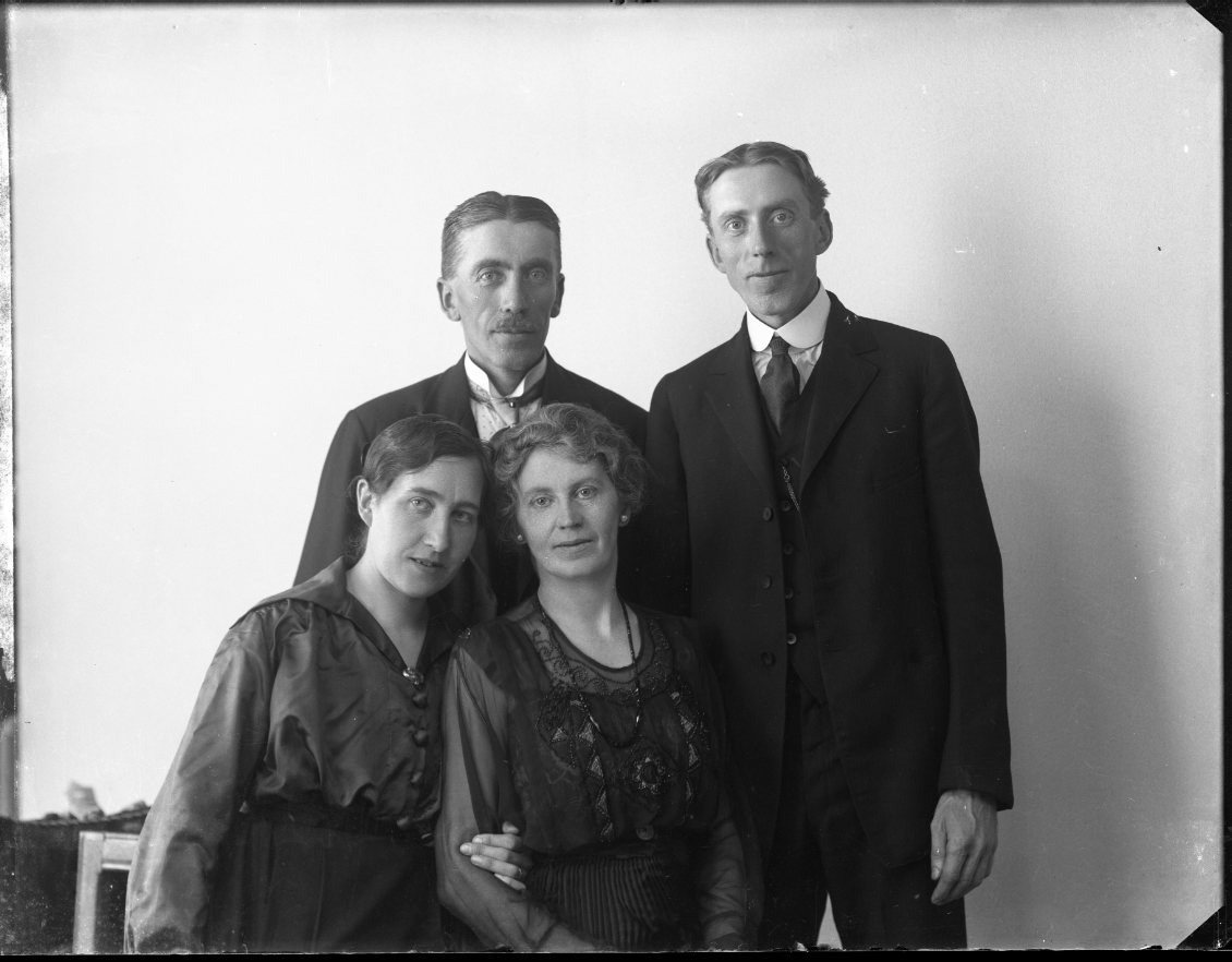 Gruppbild med två män som står bakom två tätt sittande kvinnor. Någon av männen är slaktare Augustsson i Gränna.