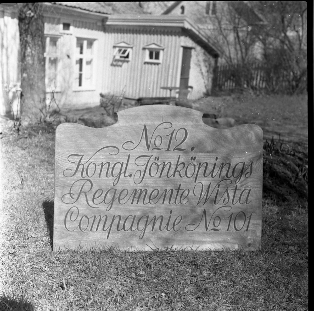 Skylt för soldattorp Bohult nr 101 på gräsmattan vid museigården.