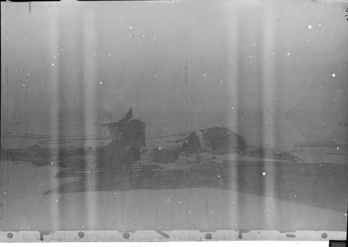 Oretuscherad. Ballongen Örnens landningsplats. Två oidentifierade personer vid kälke respektive bärring. Unionsflaggan hissad på gondolen. Samma scen som gm.II-32 och gm.II-33.