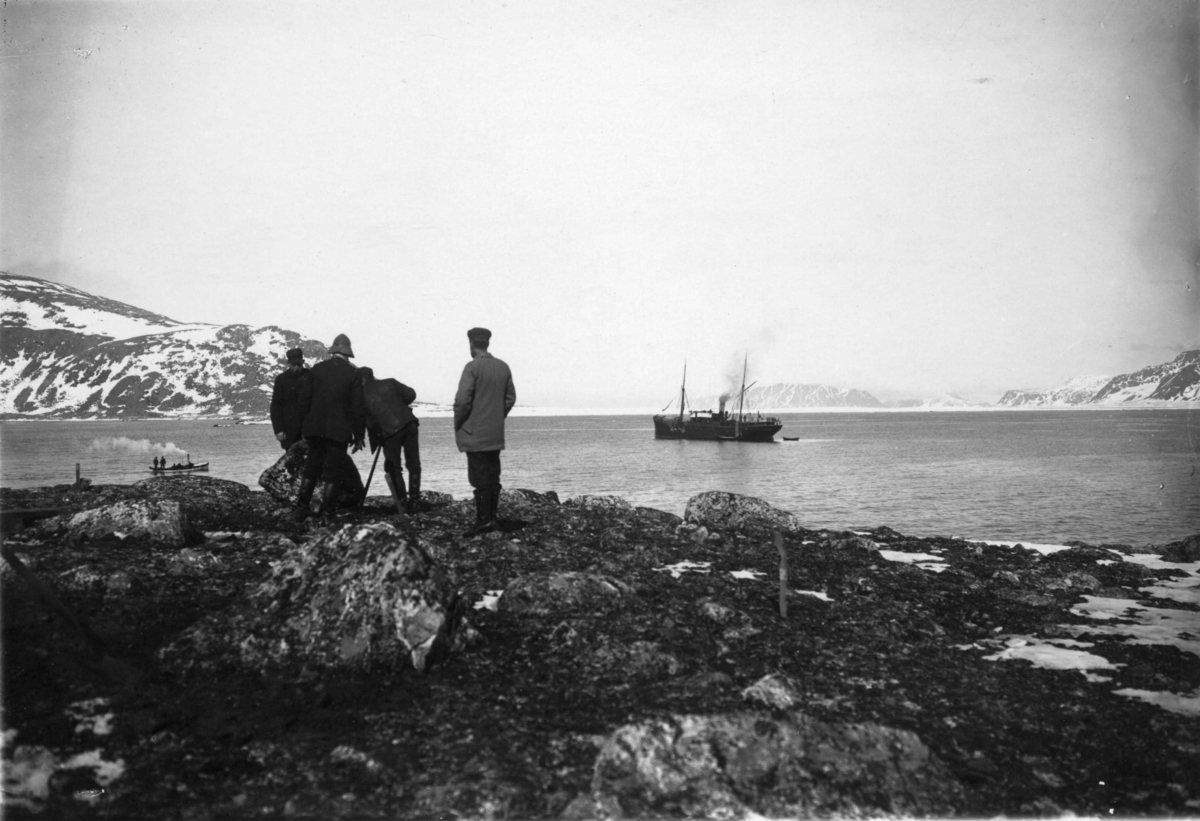 Platsen för ballonghuset markeras. Andrée till vänster och sannolikt Ekholm till höger.