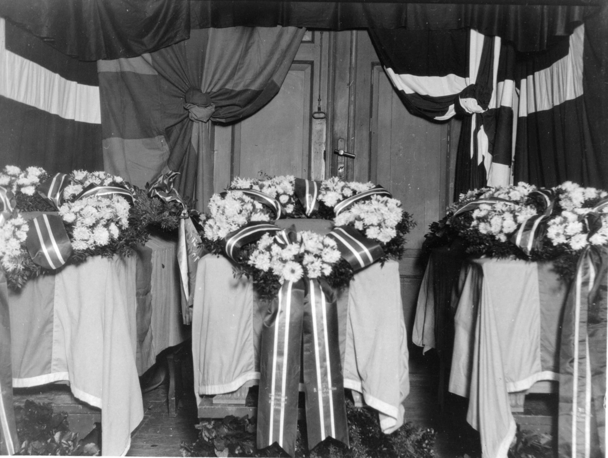 "Kistene fotografert i Tromsö Domkirka, i sondre tverskib. I mitten: Andrees, - til venstre: Strindbergs. - og til höire: Fränkels kiste."