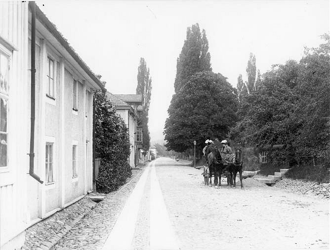 En åkvagn med två hästar och 5-6 passagerare stående på Brahegatan strax söder om Hjertströmska gården, möjligen nedanför Brahegatan 66, i sydlig riktning.