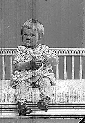 Märta Jansson, en liten flicka i klänning sittande på en soffa av sengustavianskt snitt.