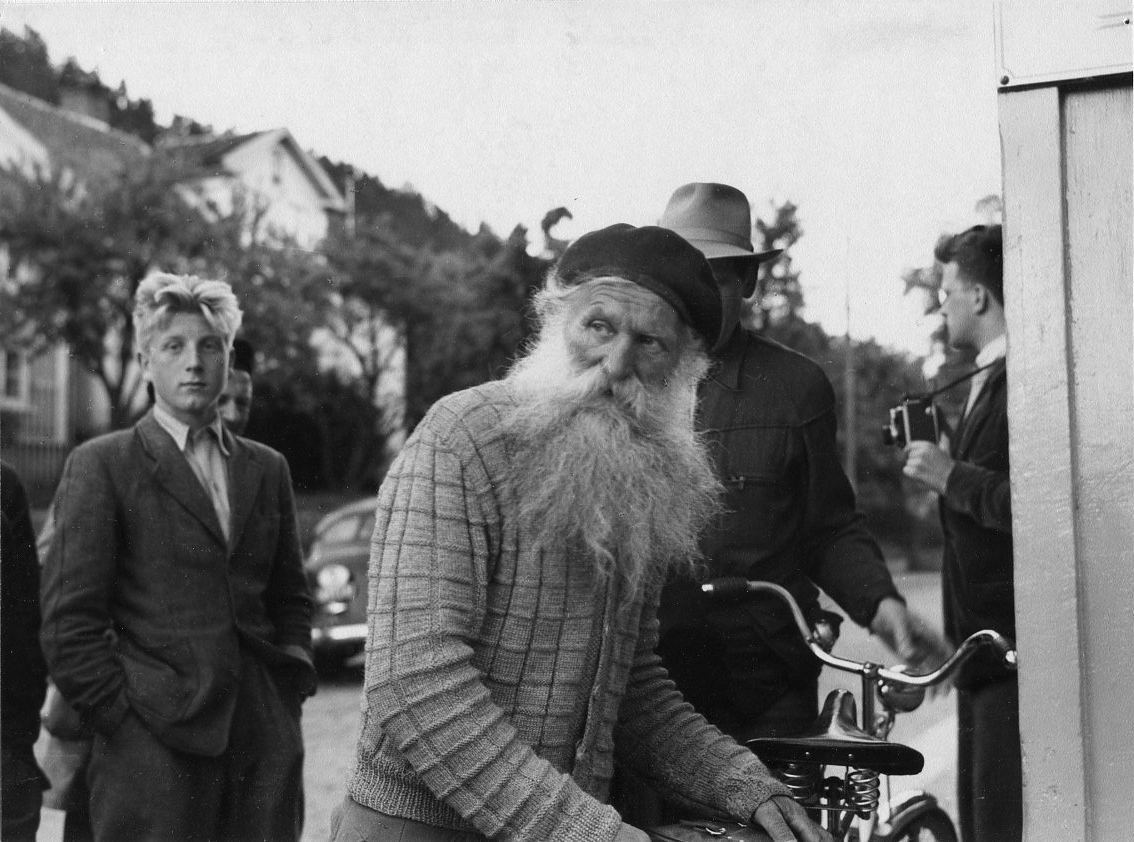 "Stålfarfar" med långt skägg, basker och stickad kofta står vid sin cykel på Brahegatan i Gränna. Pojken till vänster är Inge Carlsson.