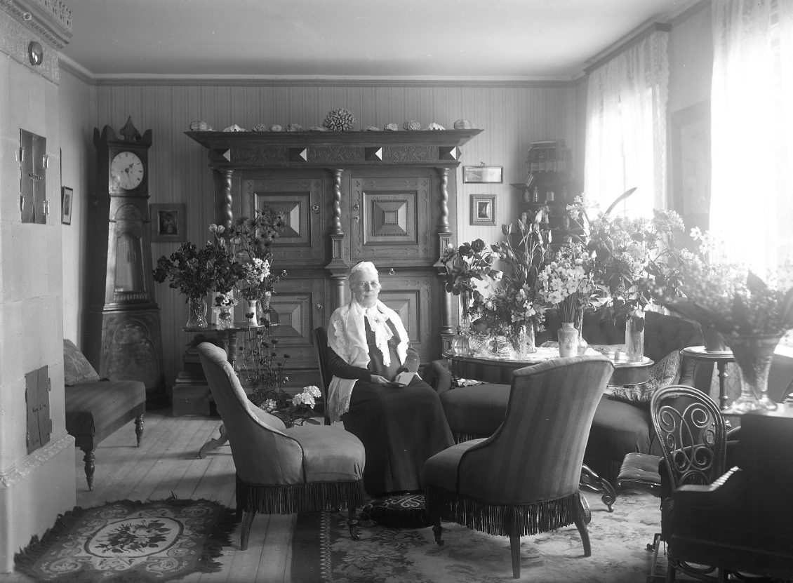 Änkefru Larsson i sitt hem på Bergsgatan i Gränna. Det är sommar och solen lyser in genom fönstren mot väster.