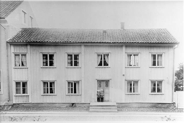 Två små barn står utanför dörren till en tvåvåningsbyggnad med locklistpanel.
