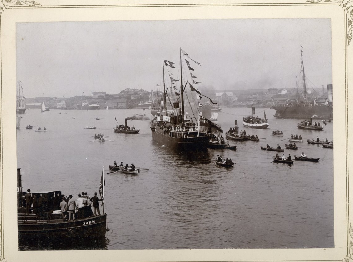 Virgo lämnar Göteborg för färd mot Spetsbergen. Ett flertal större och mindre båtar följer i dess kölvatten. På akterdäck syns Lachambre, Strindberg och Arrhenius.