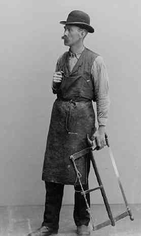 Porträtt av snickaren Fredrik Karlsson i helfigur. Han står lite vänd åt vänster med hatt på huvudet, förskinn samt såg och hyvel i höger hand.