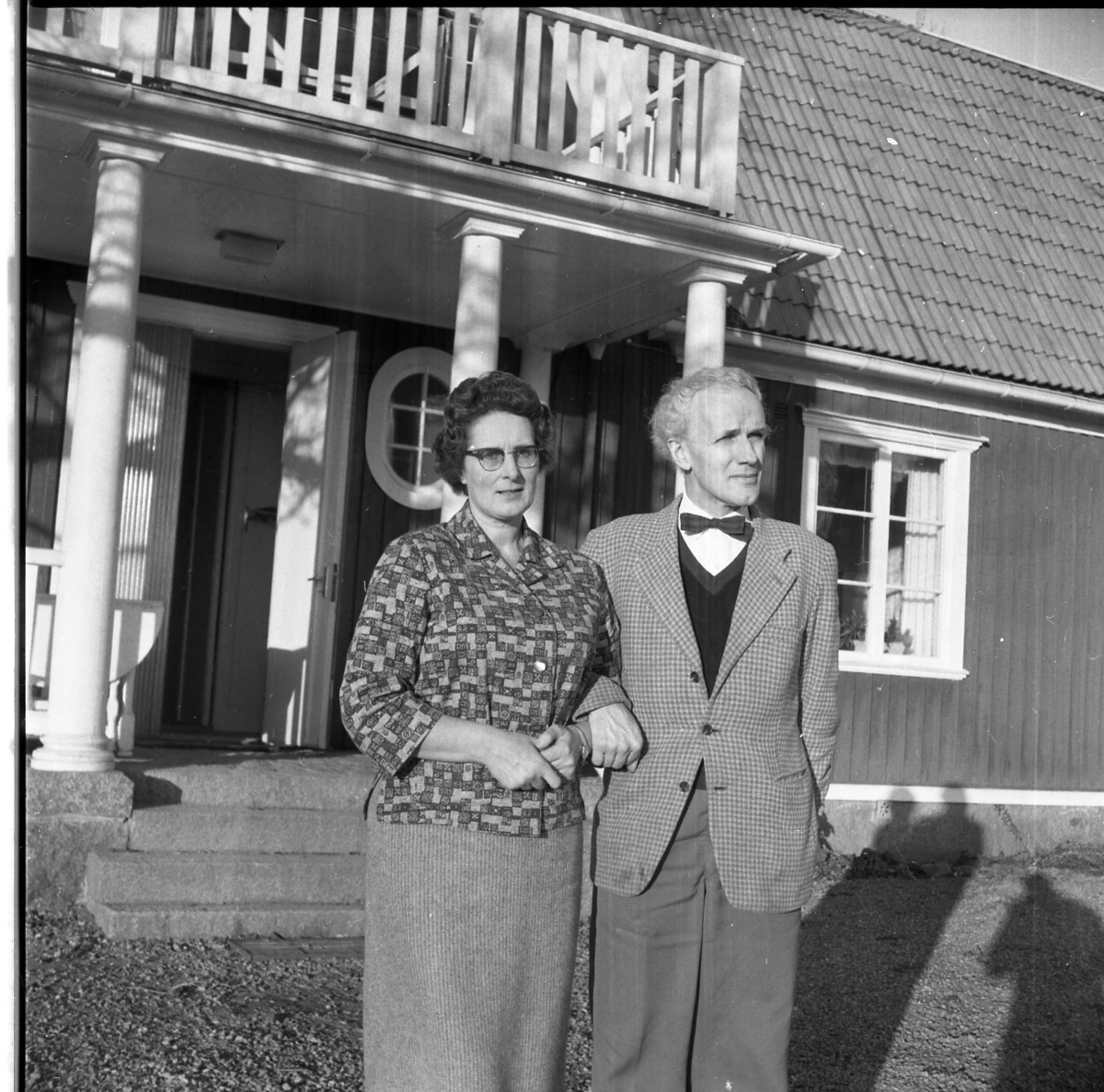 Titel: Paret Eva och Tore Lord står utanför entrén till Vireda Prästgård. En balkong buren av doriska pelare ovanför entrén.
