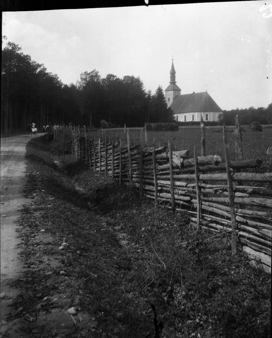 Vägen upp till Brahekyrkan, längst bort i bilden. En gärsgård löper till höger utmed vägen.
