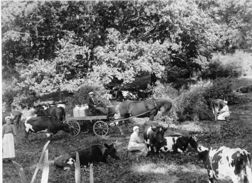 Kvinnor mjölkar kor på äng. En man sitter på en vagn med mjölktunnor bakom en häst.