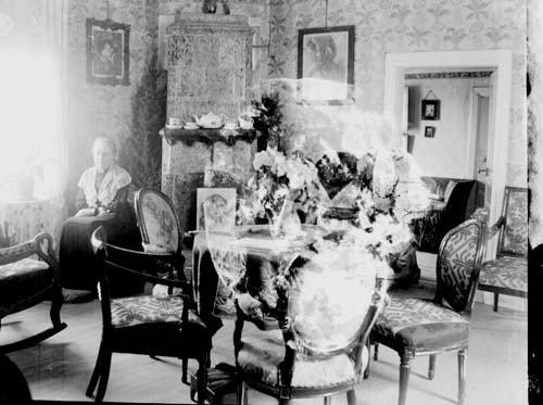 Interiör hos fröken Franck, som sitter i salongen mellan ett fönster mot Brahegatan och en kakelugn.