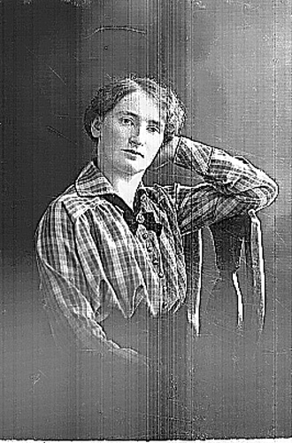 Bröstbild av en ung kvinna i mörk klänning och rutig blus. Hon sitter på tvären på en stol med vänster arm på ryggstödet. Hon vilar huvudet mot samma hand.