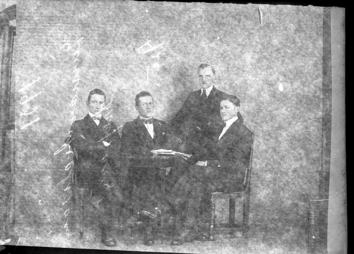 Fyra unga män sitter respektive står runt ett litet bord där det ligger en tidning. En av männen är Gunnar Axelsson från Drefseryd.