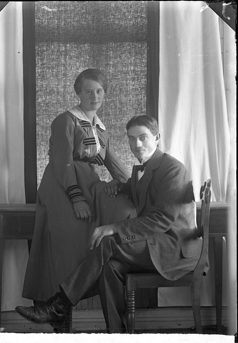 Gruppbild med en ung kvinna och man. Hon halvsitter på ett skrivbord, han på en stol nedanför. Han håller sin högerhand på hennes vänsterknä. De är Linnea Samuelsson och Otto Johansson i Lommaryd.