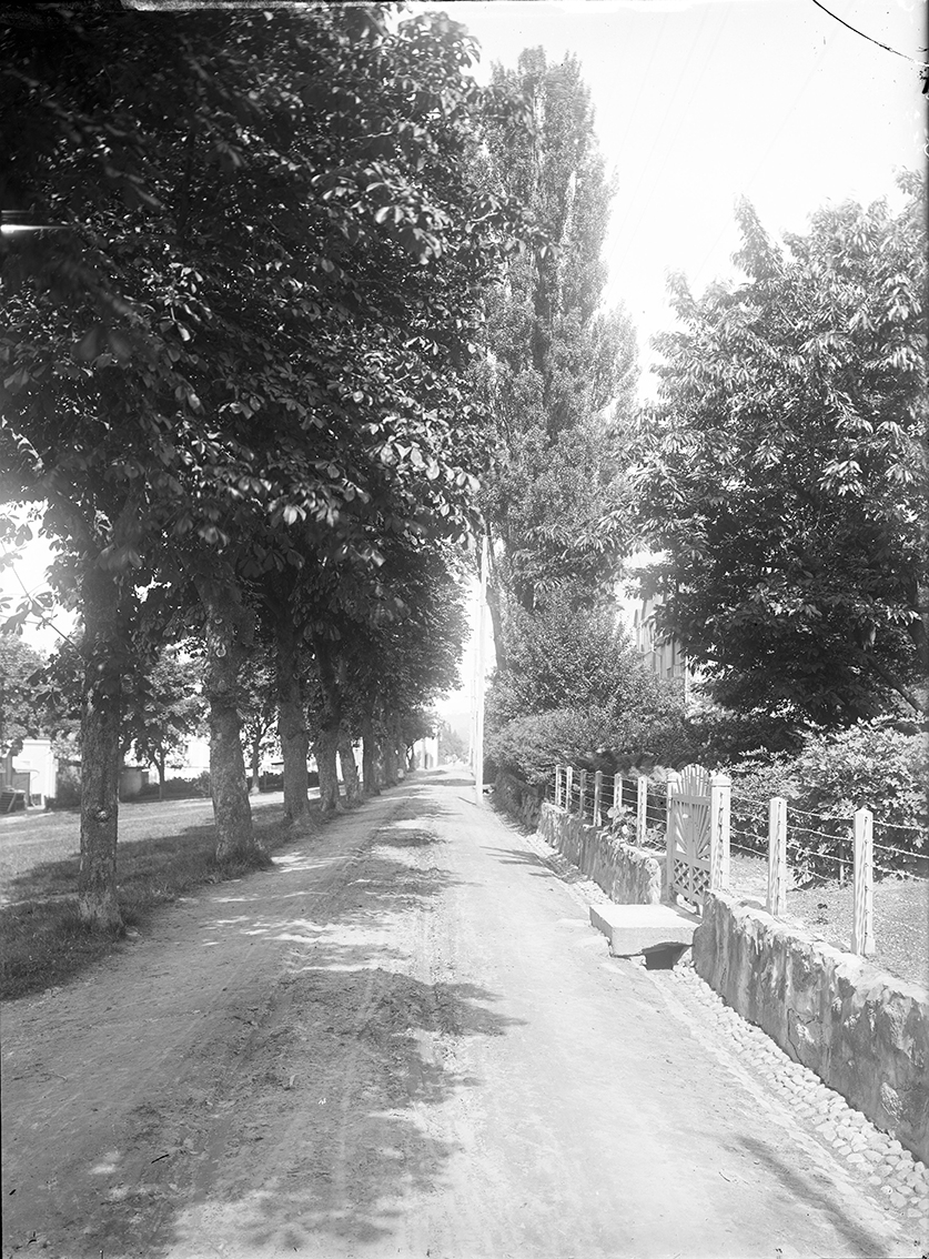 Bergsgatan i Gränna, från torget mot norr. Vägen är obelagd. Torgets östra del (till vänster) kantas av träd. Borgmästargården trädgård till höger.