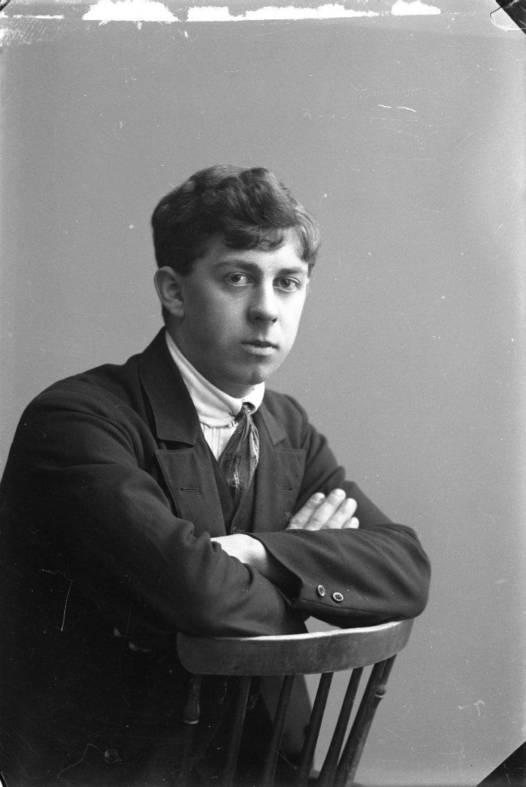 Porträtt av en ung. Han sitter bakvänd på en stol med armarna kors på stolsryggen.