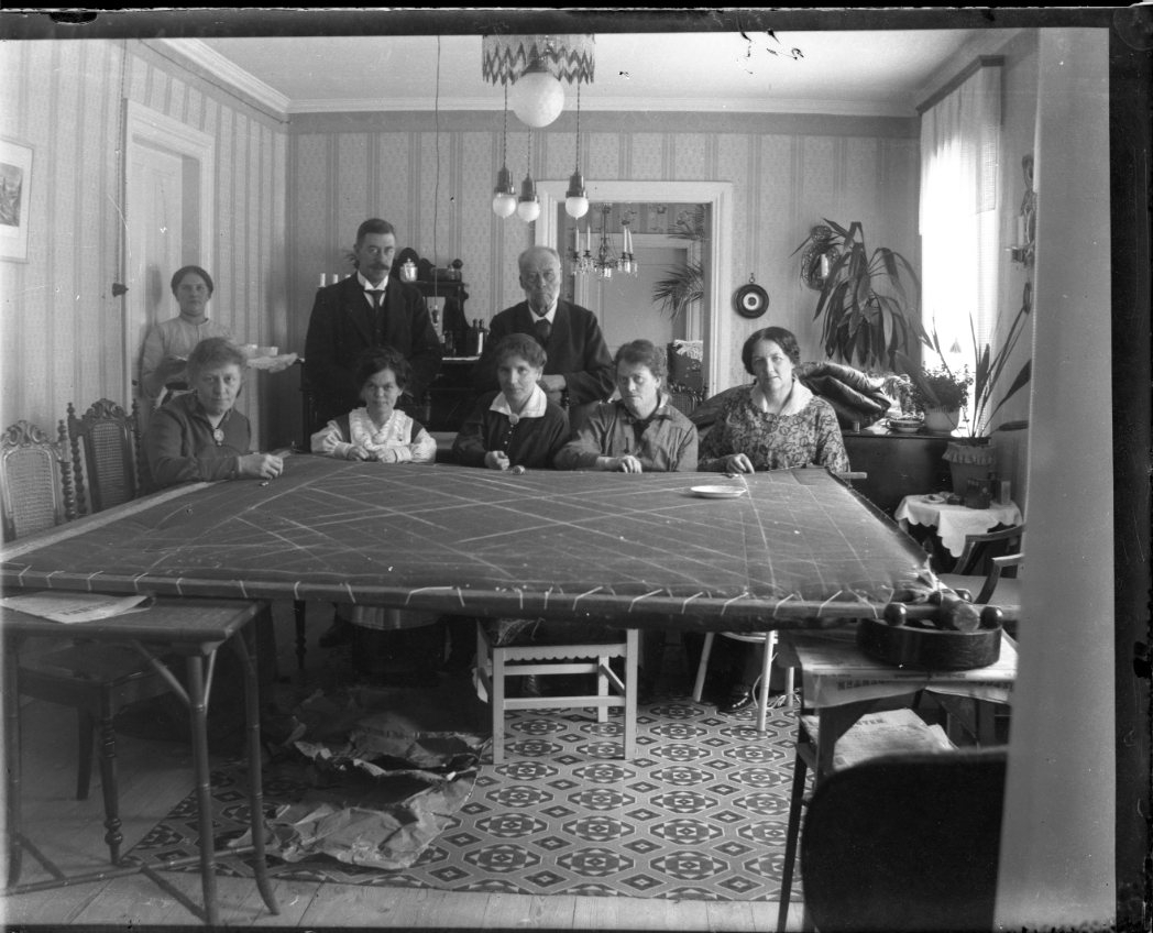 Fem kvinnor sitter vid borte änden av en uppspänd duk - de syr ett lapptäcke. Bakom dem står två män och ytterligare ett steg bakom till vänster en kvinna med en kaffebricka.